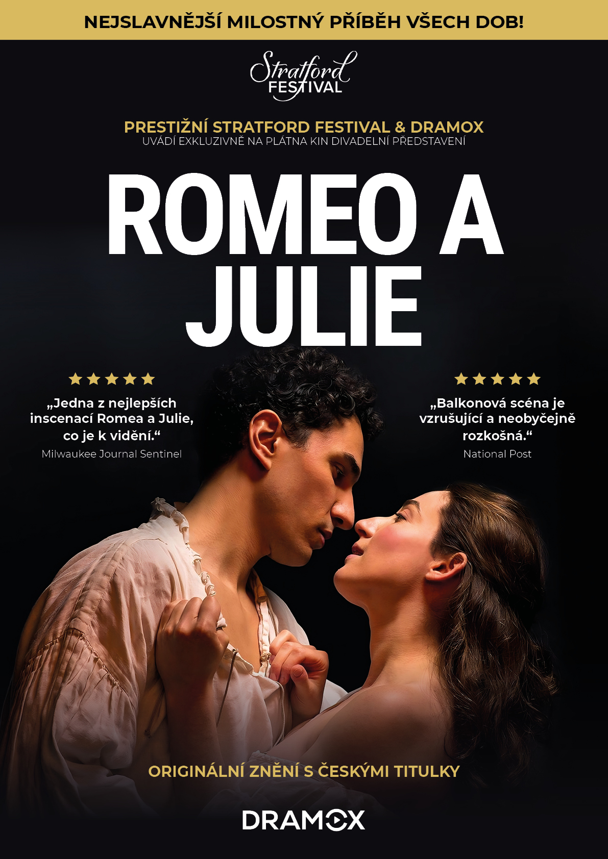Nejslavnější milostný příběh a nejprestižnější Shakespeare festival v Severní Americe, s titulky na podkladu mistrovského překladu Martina Hilského. V klasickém zpracování známého příběhu se dva mladí milenci do sebe bezhlavě zamilují navzdory nenávisti mezi svými rodinami. Za odvahu milovat svého nepřítele draze platí a jejich láska neodvratně spěje k tragickému konci. Stratford Festival předkládá shakespearovskou klasiku v dobových, autenticky působících kostýmech, které jsou propracované do posledního detailu. Na jednoduché scéně doslova září a poutají pozornost k silným hereckým výkonům.